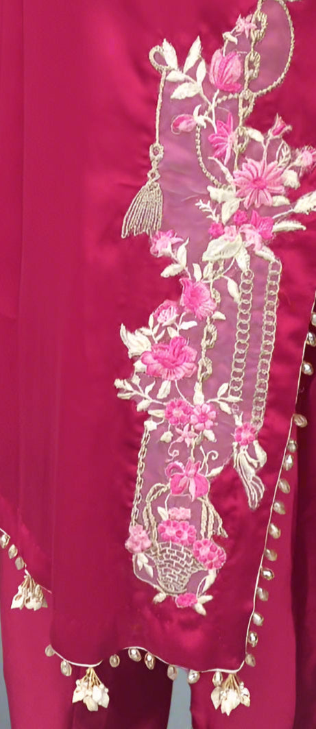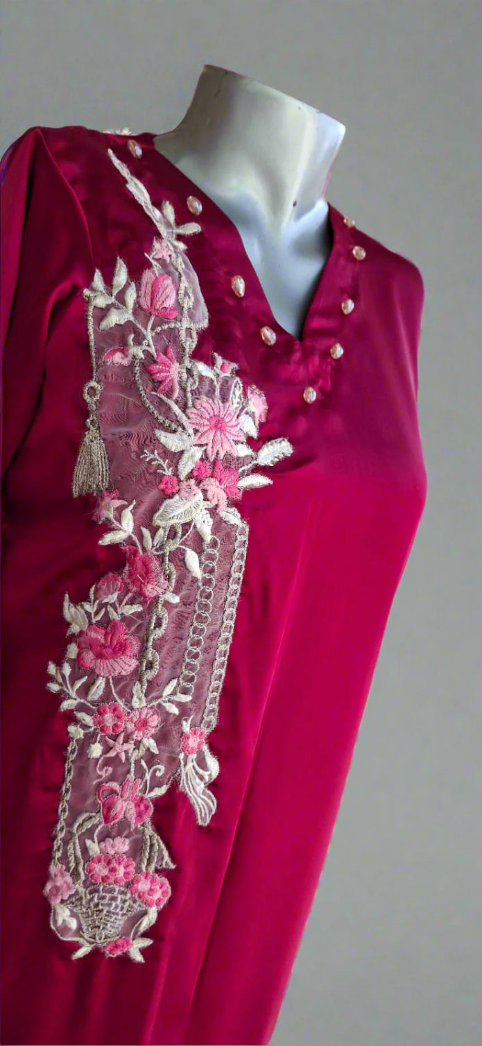 Shirt: A straight tunic shirt having embroidery work on both front side with heavy metallic beads and seashell tassels . V shape neck design with metallic beads and embroidery along the side of the chest and shoulder area. Sleeves are bell in shape with metallic beads.