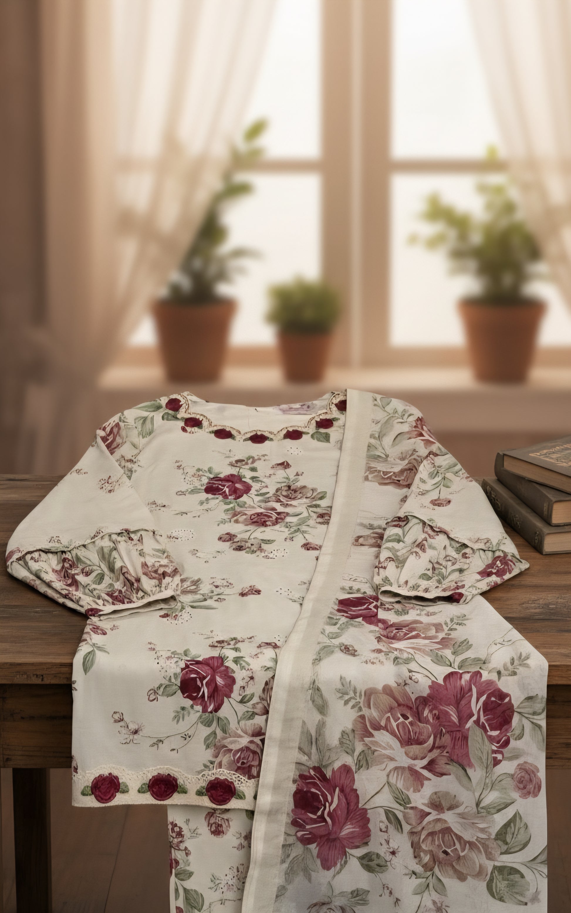 3pc Lawn cream with deep rose floral printed suit with chiffon dupatta