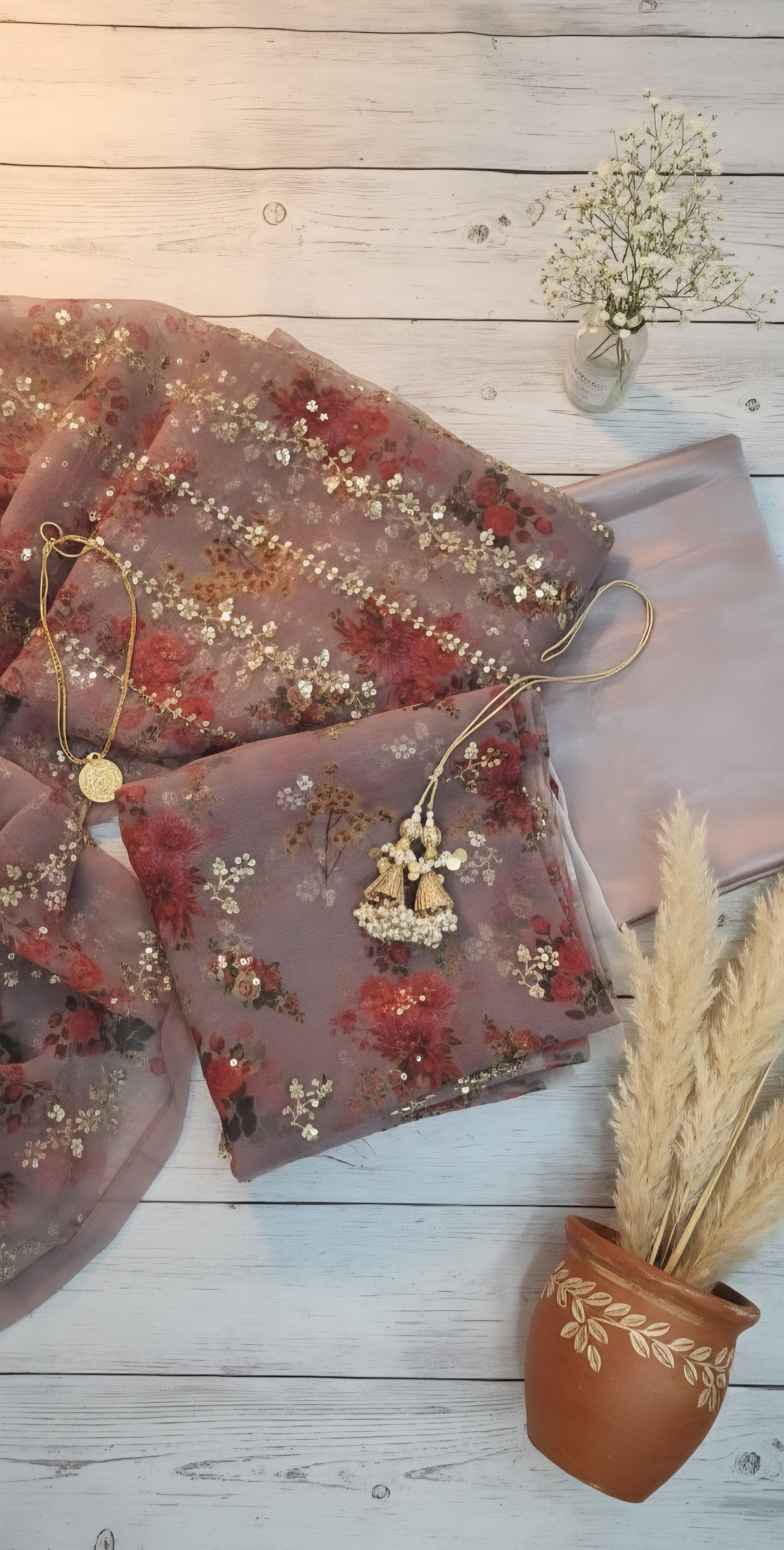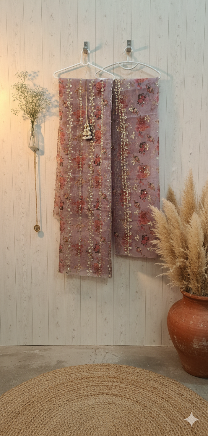 Dupatta: Heavy work on borders and scattered throughout the floral print.