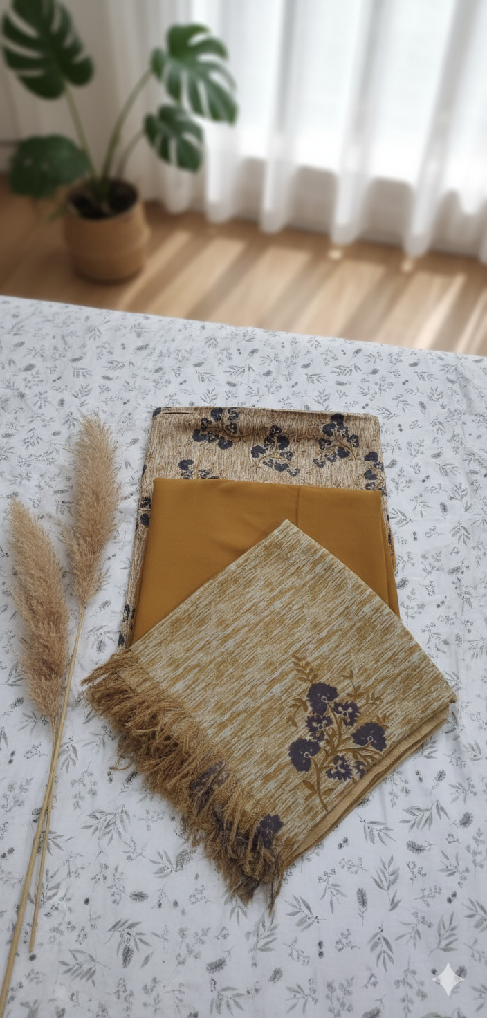 Dupatta: Mustard and grey with mustard floralprint Pashmeena shawl.
