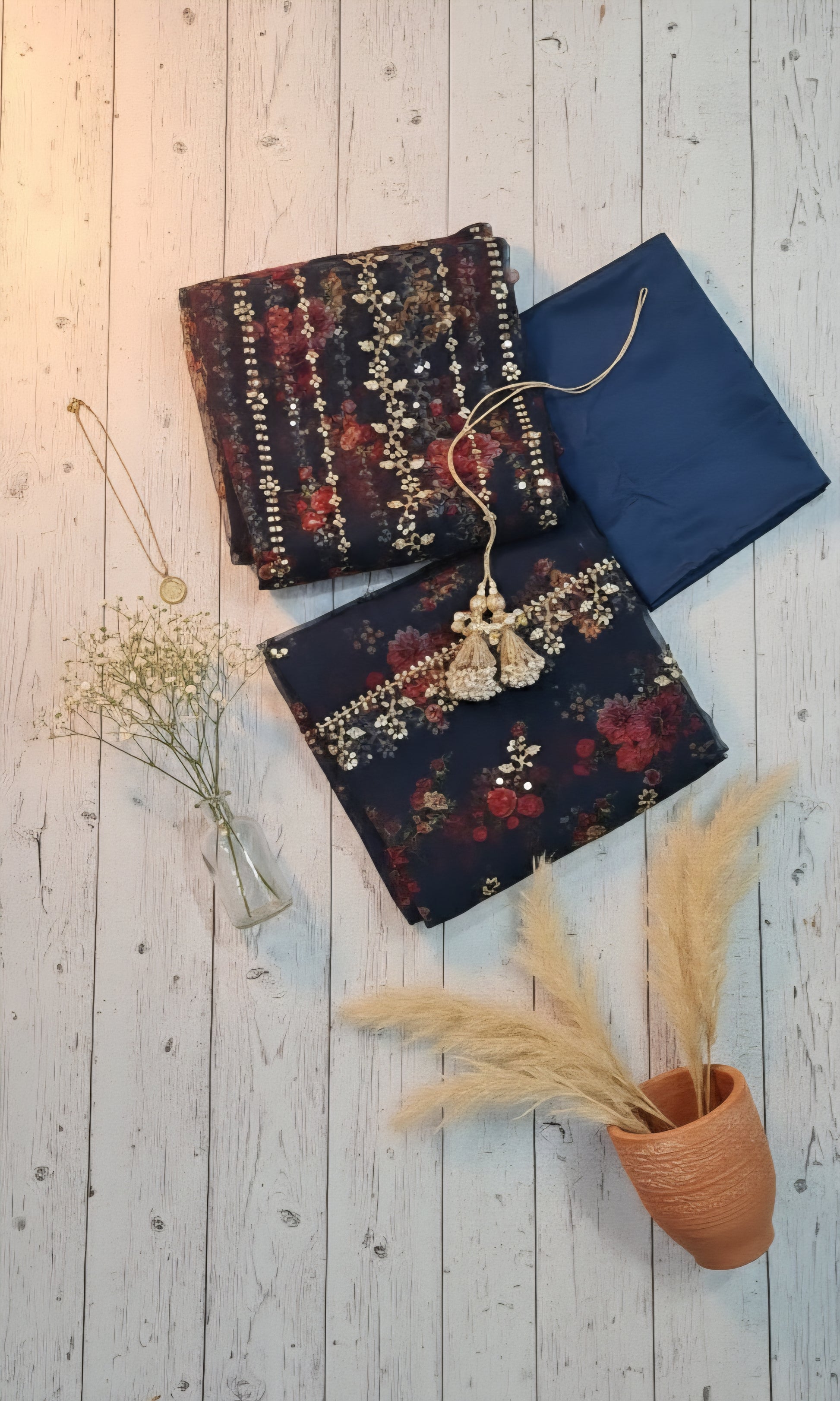 Dupatta: Heavy work on borders and scattered throughout the floral print.